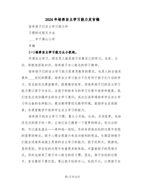 2024年自主学习讲稿范本尊敬的老师、亲爱的同学们:大家好!我是XX,今天我要和大家分享的主题是《自主学习》。
