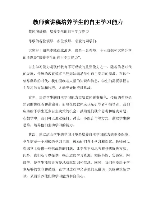 培养学生自主学习能力的教师演讲稿尊敬的各位领导、亲爱的同事们,大家好!我今天很荣幸能够站在这里,与大家分享一个关键的教育主题:培养学生自主学习能力。