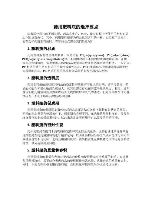 而在选择药用塑料瓶时,有哪些要点需要我们注意呢?1. 塑料瓶的材质药用塑料瓶的材质种类繁多,常见的有PP(polypropylene)、PE(polyethylene)、PET(polyethylene terephthalate)等,不同的材质有不同的性质和适用范围。