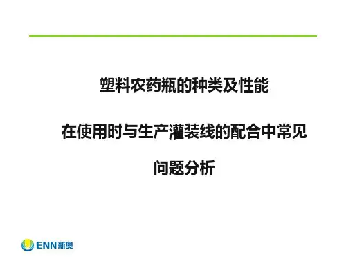常见问题与解决方案在使用药用塑料瓶的过程中,可能会出现一些问题,下面是一些常见问题及解决方案的介绍:药品变色药品变色可能由于以下原因:•隔离性不好:药用塑料瓶容易与药品起化学反应,从而导致药品的变色;•浸润性不好:药品有可能渗透到药用塑料瓶壁的内部,从而导致药品的变色。