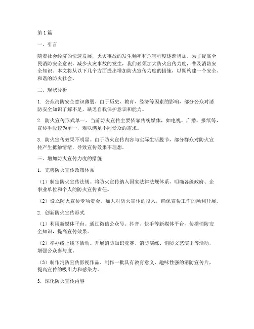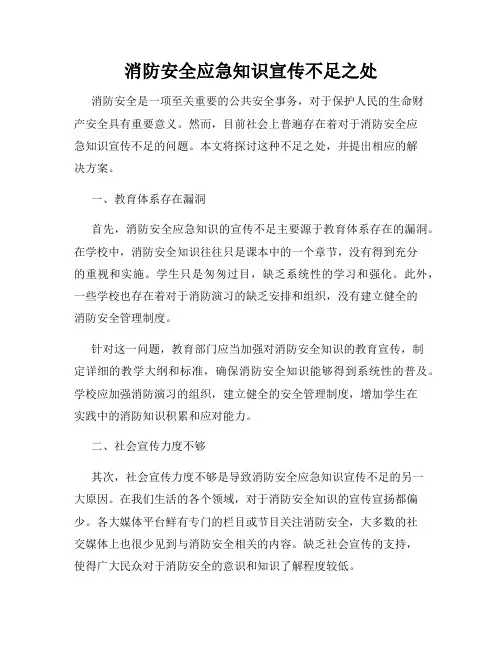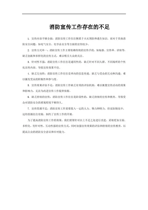 二、加强消防安全知识宣传的措施为了改善目前的消防安全知识宣传现状,我们应该采取以下几个方面的措施:1. 多渠道宣传:除了传统的电视广告和宣传单张,我们还可以利用新媒体平台进行宣传,例如通过微博、微信等社交平台,传播消防安全知识。