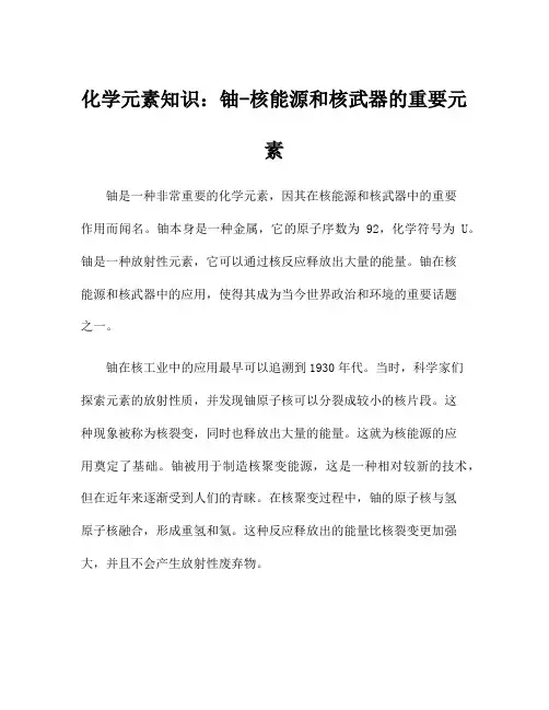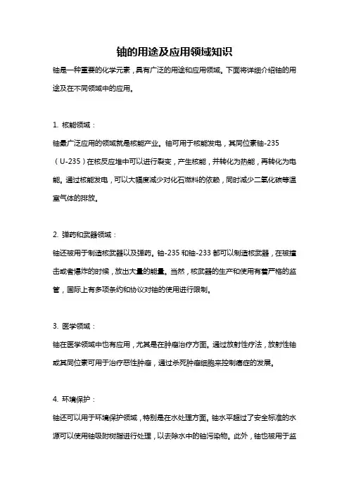 二、镭元素的应用1. 医疗领域:镭元素在医学领域有着重要的应用,特别是在肿瘤治疗中。
