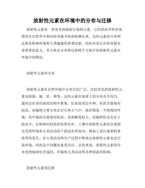 放射性元素在环境中的分布与迁移放射性元素是一类易导致辐射污染的元素,它们的化学性质使得其在自然界中相对较易被寻找和检测出来。
