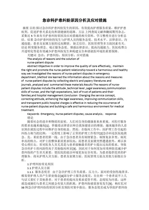 关键词急诊;护患纠纷;原因分析;应对措施The analysis of reasons and the solution ofnurse-patient disputeAbstract Objective In order to improve the quality of care effectively, maintainthe right and promote the nurse-patient relationship toward a harmonious and healthy way.we investigated the reasons of nurse-patient disputes in emergencydepartment ,Method We learned the information about the reasons and measuresof nurse-patient disputes by collecting electric and papery literatures andjournals ,analyzed and summaried these materials.Results The reasons of nurse-patient disputes include the attitude ,technical level ,Legal awareness,communication skills of nurses ,and the high expectations, lack of trust of patients and theirfamilies,and hospital management.Conclusion Changing the service concept, correcting attitude, enhancing the legal awareness, improving communication skills, and transparent public hospital charges is effective in reducing the occurrence ofnurse-patient disputes and building a safe and harmonious environment for medical treatment.Keywords Emergency; Nurse-patient disputes; cause analysis;response绪论随着社会的进步和物质的富裕,人们对自身的健康愈来愈重视,对医疗服务的要求也越来越高[1],伴随着法律意识和自我保健意识的增强,越来越多的人意识到在就医过程中应维护自身的权益。