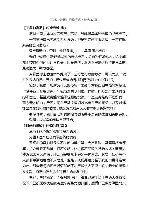 《非暴力沟通》的读后感(精选37篇)《非暴力沟通》的读后感篇1历时一周,将这本不深奥,不长,能够指导实践沟通的书看完了。
