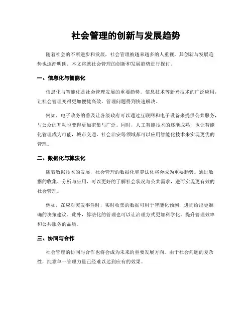 社会管理的创新与发展趋势随着社会的不断进步和发展,社会管理被越来越多的人重视,其创新与发展趋势也逐渐明朗。