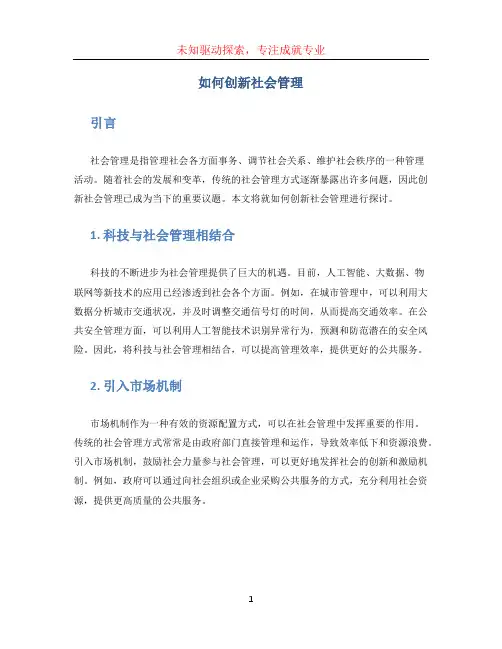 【关键词】社会管理创新, 现状与问题, 重要性, 路径探索, 成功案例分析, 创新技术, 应用, 发展方向, 结语1. 引言1.1 社会管理创新的路径分析社会管理是指政府或组织对社会事务进行管理的一种方式,社会管理的创新是指在现有管理方式基础上引入新的方法、理念和技术,以适应社会发展的需求和变化。