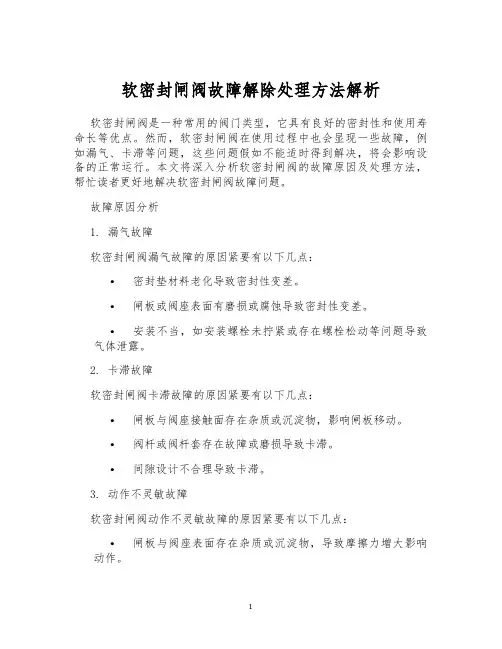 2. 卡滞故障软密封闸阀卡滞故障的原因紧要有以下几点:•闸板与阀座接触面存在杂质或沉淀物,影响闸板移动。