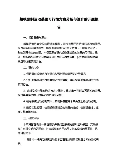 船模强制运动装置可行性方案分析与设计的开题报告一、项目背景与意义船模是模仿真实船舶建造的模型,常常被用于进行模拟试验和展示。