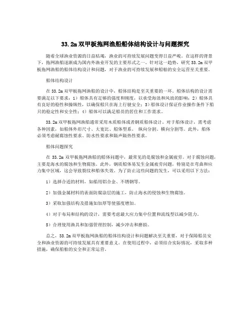 33.2m双甲板拖网渔船船体结构设计与问题探究渔船是渔业生产中重要的工具之一,而船体结构设计对于渔船的使用和性能具有至关重要的影响。