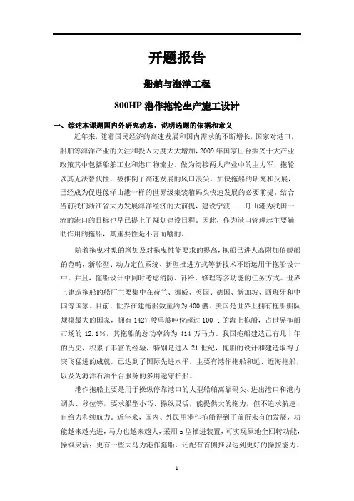 开题报告船舶与海洋工程800HP港作拖轮生产施工设计一、综述本课题国内外研究动态,说明选题的依据和意义近年来,随着国民经济的高速发展和国内需求的不断增长,国家对港口,船舶等海洋产业的关注和投入力度大大增加,2009年国家出台振兴十大产业政策其中包括船舶工业和港口物流业。
