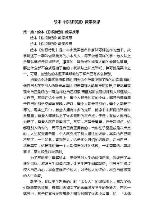 绘本《你很特别》教学反思第一篇:绘本《你很特别》教学反思绘本《你很特别》教学反思绘本《你很特别》教学反思绘本《你很特别》是一本由美国著名作家陆可铎创作的童书。