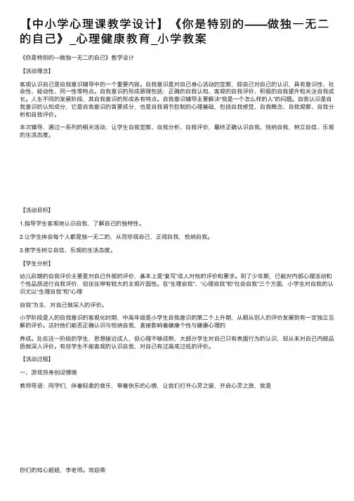 【中⼩学⼼理课教学设计】《你是特别的——做独⼀⽆⼆的⾃⼰》_⼼理健康教育_⼩学教案《你是特别的—做独⼀⽆⼆的⾃⼰》教学设计【活动理念】客观认识⾃⼰是⾃我意识辅导中的⼀个重要内容。