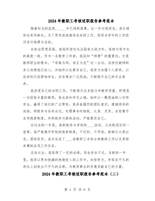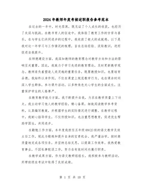2024年度考核教师个人述职报告篇1光阴荏苒,白驹过隙,转瞬间,一年的教学工作已接近尾声,为了更好地做好今后的工作,总结经验、吸取教训,本人就#年度的工作述职如下:一、政治思想方面:本人热爱党,热爱人民,坚持党的教育方针,忠诚党的教育事业。
