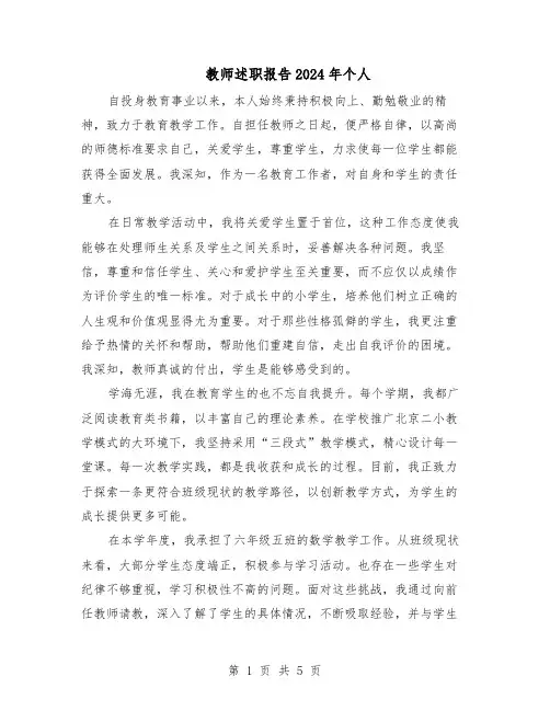教师述职报告2024年个人自投身教育事业以来,本人始终秉持积极向上、勤勉敬业的精神,致力于教育教学工作。