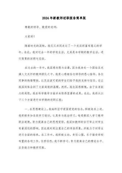 2024年新教师个人述职报告参考范文自____年____月,我荣幸地踏上了人民教师的岗位,肩负起培养祖国花朵的重任。