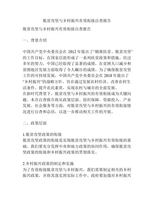 脱贫攻坚与乡村振兴有效衔接自查报告脱贫攻坚与乡村振兴有效衔接自查报告一、背景介绍中国共产党中央委员会在2012年提出了“精准扶贫、脱贫攻坚”的工作目标,在国家层面形成了一系列扶贫政策和措施。
