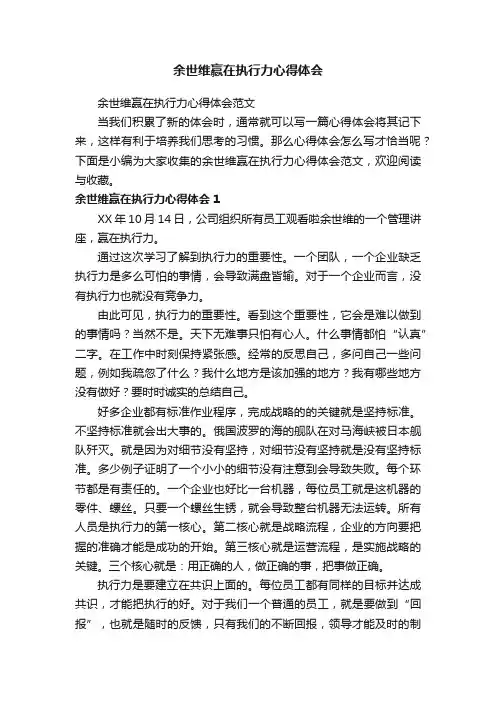 赢在执行力心得体会〔共3篇〕(赢在执行力心得体会)第1篇:赢在执行力心得体会 10月15日公司安排了余世维的《赢在执行力》的视频培训学习,在学习过程中,全面了解了领导力和执行力以及如何做好一名优秀的管理者的重要性。