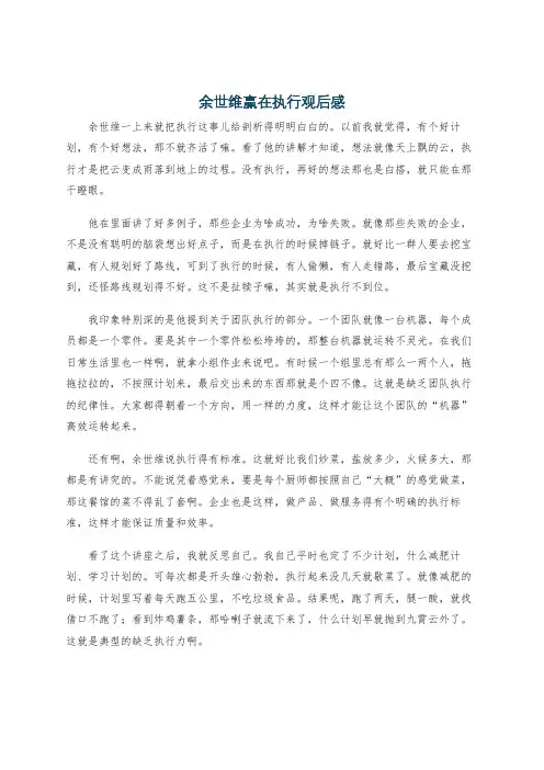 余世维赢在执行力心得体会1XX年10月14日,公司组织所有员工观看啦余世维的一个管理讲座,赢在执行力。