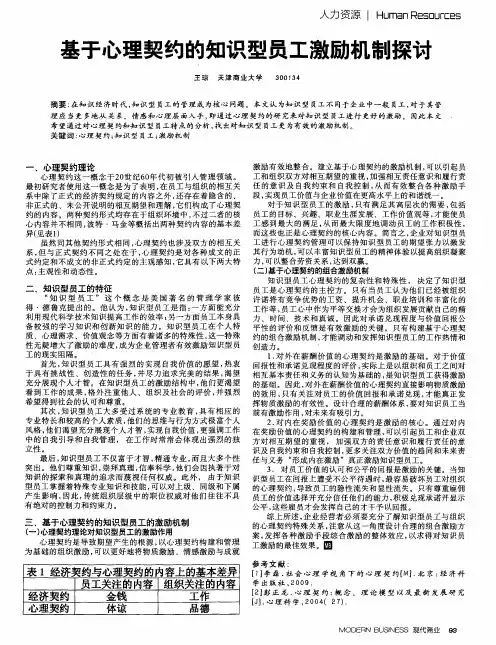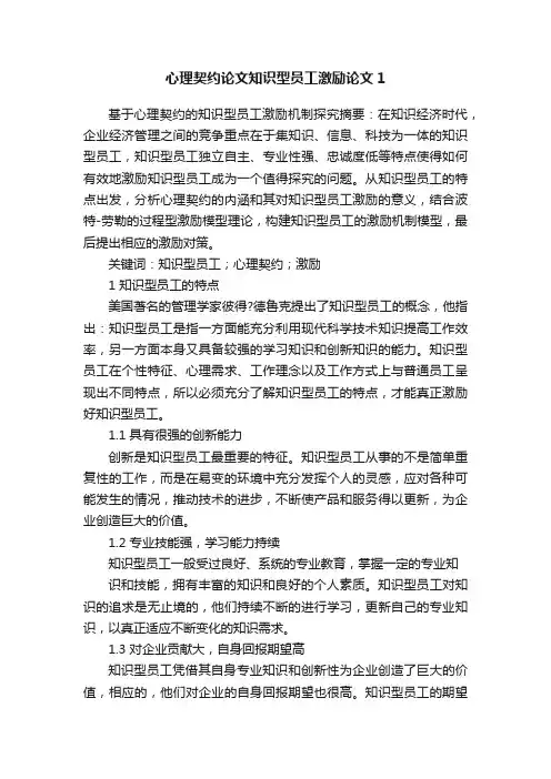 心理契约论文知识型员工激励论文1基于心理契约的知识型员工激励机制探究摘要:在知识经济时代,企业经济管理之间的竞争重点在于集知识、信息、科技为一体的知识型员工,知识型员工独立自主、专业性强、忠诚度低等特点使得如何有效地激励知识型员工成为一个值得探究的问题。