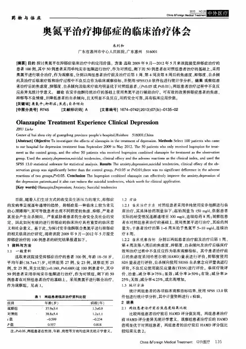 奥氮平对伴有焦虑的抑郁症的治疗作用梁海翔;任丽娜;刘梅;韩毅【摘要】Objective:To assess the clinical efficacy and safety of citalopram combined with low dose olanzapine in treatment of depression with anxiety symptoms. Method:68 depressive patients with anxiety symptoms were randomly divided into research group which received citalopram plus olanzapine treatment and control group which received citalopram treatment for 8 weeks. Curative effects were assessed using Hamilton depression scale (HAMD) and Hamilton anxiety scale (HAMA). Adverse reactions were assessed with treatment emergent symptoms scale (TESS). Results:The two groups showed significant score decreases on HAMD and HAMA,but the research group showed faster score drop on HAMD and HAMA and had higher effective rate than control group. There were no significant differences on TESS score between the two groups. Conclusion:Citalopram plus olanzapine is effective and safe and has better compliance in treatment of depression with anxiety symptoms.%目的:观察西酞普兰合并小剂量奥氮平治疗伴有焦虑的抑郁症患者的临床疗效和安全性.方法:将68例伴有焦虑的抑郁症患者随机分为两组,研究组给予西酞普兰合并奥氮平治疗,对照组给予两酞普兰治疗,疗程均为8周.采用汉密尔顿抑郁量表(HAMD)及汉密尔顿焦虑量表(HAMA)评定临床疗效,治疗中出现的症状量表(TESS)评定不良反应.结果:治疗8周末两组HAMD及HAMA评分均显著性下降(P均<0.01).研究组起效较快,显效率高于对照组(P<0.05),两组不良反应均较轻微.结论:西酞普兰合并奥氮平对伴有焦虑的抑郁症起效快,疗效肯定,安全性高,依从性好.【期刊名称】《临床精神医学杂志》【年(卷),期】2011(021)001【总页数】2页(P45-46)【关键词】西酞普兰;奥氮平;抑郁症【作者】梁海翔;任丽娜;刘梅;韩毅【作者单位】300022,天津安定医院;300022,天津安定医院;300022,天津安定医院;300022,天津安定医院【正文语种】中文【中图分类】R749.4目前研究认为抑郁症的发病可能与中枢去甲肾上腺素和5-羟色胺(5-TH)功能低下有关,也有不少研究认为抑郁症患者存在中脑边缘系统多巴胺功能失调和受体功能低下,因此抗抑郁药与奥氮平合并治疗抑郁症可能疗效会更好[1]。