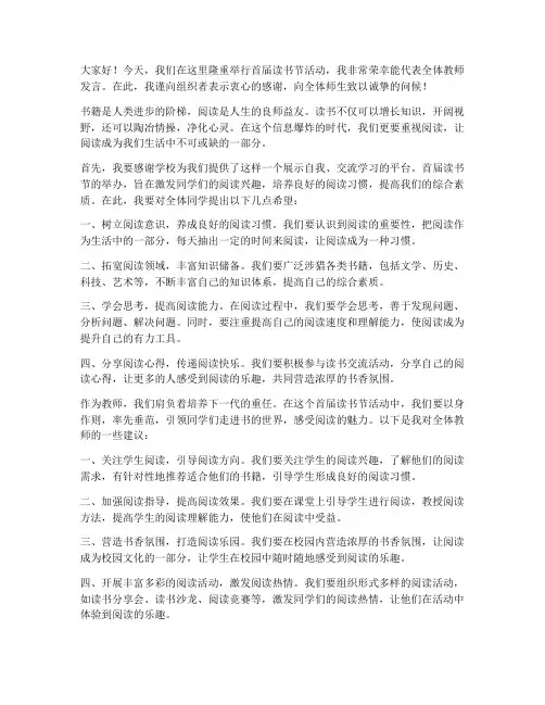 大家好!今天,我们在这里隆重举行首届读书节活动,我非常荣幸能代表全体教师发言。
