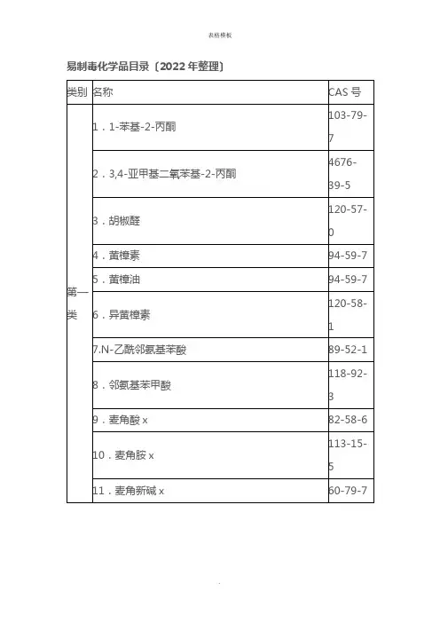 危险品易制爆易制毒清单含CASNO品名别名CAS号备注阿片鸦片8008-60-4氨液氨;氨气7664-41-75-氨基-1,3,3-三甲基环己甲胺异佛尔酮二胺;3,3,5-三甲基-4,6-二氨基-2-烯环己酮;1-氨基-3-氨基甲基-3,5,5-三甲基环2855-13-25-氨基-3-苯基-1-[双(N,N-二甲基氨基氧膦基)]-1,2,4-三唑[含量>20%]威菌磷1031-47-6剧毒4-[3-氨基-5-(1-甲基胍基)戊酰氨基]-1-[4-氨基-2-氧代-1(2H)-嘧啶基]-1,2,3,4-四脱氧-β,D赤己-2-烯吡喃糖醛酸灰瘟素2079-00-74-氨基-N,N-二甲基苯胺N,N-二甲基对苯二胺;对氨基-N,N-二甲基苯胺99-98-92-氨基苯酚邻氨基苯酚95-55-6 3-氨基苯酚间氨基苯酚591-27-5 4-氨基苯酚对氨基苯酚123-30-8 3-氨基苯甲腈间氨基苯甲腈;氰化氨基苯2237-30-1 2-氨基苯胂酸邻氨基苯胂酸2045-00-3 3-氨基苯胂酸间氨基苯胂酸2038-72-4 4-氨基苯胂酸对氨基苯胂酸98-50-0 4-氨基苯胂酸钠对氨基苯胂酸钠127-85-5 2-氨基吡啶邻氨基吡啶504-29-0 3-氨基吡啶间氨基吡啶462-08-84-氨基吡啶对氨基吡啶;4-氨基氮杂苯;对氨基氮苯;γ-吡啶胺504-24-51-氨基丙烷正丙胺107-10-82-氨基丙烷异丙胺75-31-03-氨基丙烯烯丙胺107-11-9剧毒4-氨基二苯胺对氨基二苯胺101-54-2氨基胍重碳酸盐2582-30-1氨基化钙氨基钙23321-74-6氨基化锂氨基锂7782-89-0氨基磺酸5329-14-65-(氨基甲基)-3-异噁唑醇3-羟基-5-氨基甲基异噁唑;蝇蕈醇2763-96-4氨基甲酸胺1111-78-0 (2-氨基甲酰氧乙基)三甲基氯化铵氯化氨甲酰胆碱;卡巴考51-83-23-氨基喹啉580-17-6 2-氨基联苯邻氨基联苯;邻苯基苯胺90-41-5 4-氨基联苯对氨基联苯;对苯基苯胺92-67-1 1-氨基乙醇乙醛合氨75-39-8 2-氨基乙醇乙醇胺;2-羟基乙胺141-43-5 2-(2-氨基乙氧基)乙醇929-06-6氨溶液[含氨>10%]氨水1336-21-6N-氨基乙基哌嗪1-哌嗪乙胺;N-(2-氨基乙基)哌嗪;2-(1-哌嗪基)乙胺140-31-8八氟-2-丁烯全氟-2-丁烯360-89-4八氟丙烷全氟丙烷76-19-7八氟环丁烷RC318115-25-3八氟异丁烯全氟异丁烯;1,1,3,3,3-五氟-2-(三氟甲基)-1-丙烯382-21-8剧毒八甲基焦磷酰胺八甲磷152-16-9剧毒1,3,4,5,6,7,8,8-八氯-1,3,3a,4,7,7a-六氢-4,7-甲撑异苯并呋喃[含量>1%]八氯六氢亚甲基苯并呋喃;碳氯灵297-78-9剧毒1,2,4,5,6,7,8,8-八氯-2,3,3a,4,7,7a-六氢-4,7-亚甲基茚氯丹57-74-9八氯莰烯毒杀芬8001-35-2八溴联苯27858-07-7白磷黄磷12185-10-3钡金属钡7440-39-3钡合金苯纯苯71-43-2苯-1,3-二磺酰肼[糊状,浓度52%]4547-70-0苯胺氨基苯62-53-3苯并呋喃氧茚;香豆酮;古马隆271-89-61,2-苯二胺邻苯二胺;1,2-二氨基苯95-54-51,3-苯二胺间苯二胺;1,3-二氨基苯108-45-21,4-苯二胺对苯二胺;1,4-二氨基苯;乌尔丝D 106-50-31,2-苯二酚邻苯二酚120-80-91,3-苯二酚间苯二酚;雷琐酚108-46-31,4-苯二酚对苯二酚;氢醌123-31-91,3-苯二磺酸溶液98-48-6苯酚酚;石炭酸苯酚溶液苯酚二磺酸硫酸溶液苯酚磺酸1333-39-7苯酚钠苯氧基钠139-02-6苯磺酰肼发泡剂BSH 80-17-1苯磺酰氯氯化苯磺酰1998/9/94-苯基-1-丁烯768-56-9N-苯基-2-萘胺防老剂D135-88-62-苯基丙烯异丙烯基苯;α-甲基苯乙烯98-83-92-苯基苯酚邻苯基苯酚90-43-7苯基二氯硅烷二氯苯基硅烷1631-84-1苯基硫醇苯硫酚;巯基苯;硫代苯酚108-98-5剧毒苯基氢氧化汞氢氧化苯汞100-57-2苯基三氯硅烷苯代三氯硅烷98-13-5苯基溴化镁[浸在乙醚中的]100-58-3苯基氧氯化膦苯磷酰二氯824-72-6N-苯基乙酰胺乙酰苯胺;退热冰103-84-4N-苯甲基-N-(3,4-二氯基本)-DL-丙氨酸乙酯新燕灵22212-55-1苯甲腈氰化苯;苯基氰;氰基苯;苄腈100-47-0苯甲醚茴香醚;甲氧基苯100-66-3苯甲酸汞安息香酸汞583-15-3108-95-2苯甲酸甲酯尼哦油93-58-3苯甲酰氯氯化苯甲酰98-88-4苯甲氧基磺酰氯苯肼苯基联胺100-63-0苯胩化二氯苯胩化氯;二氯化苯胩622-44-6苯醌106-51-4苯硫代二氯化膦苯硫代磷酰二氯;硫代二氯化膦苯3497-00-5苯胂化二氯二氯化苯胂;二氯苯胂696-28-6剧毒苯胂酸1998/5/5苯四甲酸酐均苯四甲酸酐89-32-7苯乙醇腈苯甲氰醇;扁桃腈532-28-5N-(苯乙基-4-哌啶基)丙酰胺柠檬酸盐枸橼酸芬太尼990-73-82-苯乙基异氰酸酯1943-82-4苯乙腈氰化苄;苄基氰140-29-4苯乙炔乙炔苯536-74-3苯乙烯[稳定的]乙烯苯100-42-5苯乙酰氯103-80-0吡啶氮杂苯110-86-11-(3-吡啶甲基)-3-(4-硝基苯基)脲1-(4-硝基苯基)-3-(3-吡啶基甲基)脲;灭鼠优53558-25-1剧毒吡咯一氮二烯五环;氮杂茂109-97-7 2-吡咯酮616-45-5 4-[苄基(乙基)氨基]-3-乙氧基苯重氮氯化锌盐N-苄基-N-乙基苯胺N-乙基-N-苄基苯胺;苄乙基苯胺92-59-12-苄基吡啶2-苯甲基吡啶101-82-6 4-苄基吡啶4-苯甲基吡啶2116-65-6苄硫醇α-甲苯硫醇100-53-8变性乙醇变性酒精(1R,2R,4R)-冰片-2-硫氰基醋酸酯敌稻瘟115-31-1丙胺氟磷N,N'-氟磷酰二异丙胺;双(二异丙氨基)磷酰氟371-86-81-丙醇正丙醇71-23-8 2-丙醇异丙醇67-63-0 1,2-丙二胺1,2-二氨基丙烷;丙邻二胺78-90-0 1,3-丙二胺1,3-二氨基丙烷109-76-2丙二醇乙醚1-乙氧基-2-丙醇1569-02-4丙二腈二氰甲烷;氰化亚甲基;缩苹果腈109-77-3丙二酸铊丙二酸亚铊2757-18-8丙二烯[稳定的]463-49-0丙二酰氯缩苹果酰氯1663-67-8丙基三氯硅烷141-57-1丙基胂酸丙胂酸107-34-6丙腈乙基氰107-12-0剧毒丙醛123-38-62-丙炔-1-醇丙炔醇;炔丙醇107-19-7剧毒丙炔和丙二烯混合物[稳定的]甲基乙炔和丙二烯混合物59355-75-8丙炔酸471-25-0丙酸1979/9/4丙酸酐丙酐123-62-6丙酸甲酯554-12-1丙酸烯丙酯2408-20-0丙酸乙酯105-37-3丙酸异丙酯丙酸-1-甲基乙基酯637-78-5丙酸异丁酯丙酸-2-甲基丙酯540-42-1丙酸异戊酯105-68-0丙酸正丁酯590-01-2丙酸正戊酯624-54-4丙酸仲丁酯591-34-4丙酮二甲基酮67-64-1丙酮氰醇丙酮合氰化氢;2-羟基异丁腈;氰丙醇75-86-5剧毒丙烷74-98-6丙烯115-07-12-丙烯-1-醇烯丙醇;蒜