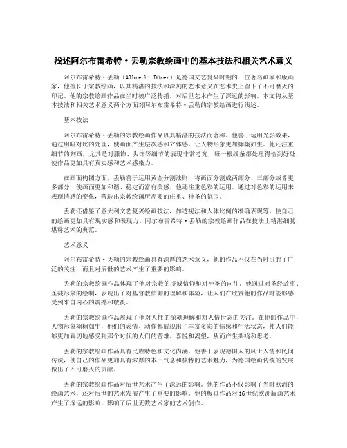 浅述阿尔布雷希特·丢勒宗教绘画中的基本技法和相关艺术意义1. 引言1.1 介绍阿尔布雷希特·丢勒阿尔布雷希特·丢勒(Albrecht Dürer,1471-1528)是德国文艺复兴时期最杰出的艺术家之一,同时也是欧洲艺术史上最伟大的绘画家和版画家之一。
