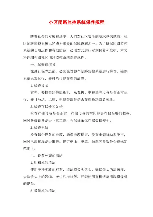 一、保养前准备在进行保养之前,必须先对整个闭路监控系统进行检查,确保系统正常运行,并排除可能存在的故障。