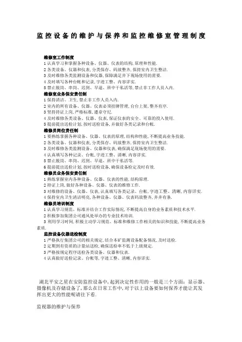 2、设备维护中的一些注意事项在对监控系统设备进行维护过程中,应对一些情况加以防范,尽可能使设备的运行正常,主要需做好防潮、防尘、防腐、防雷、防干扰的工作。