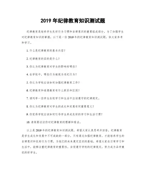 2019年纪律教育知识测试题纪律教育是培养学生良好品行和行为习惯的重要环节。