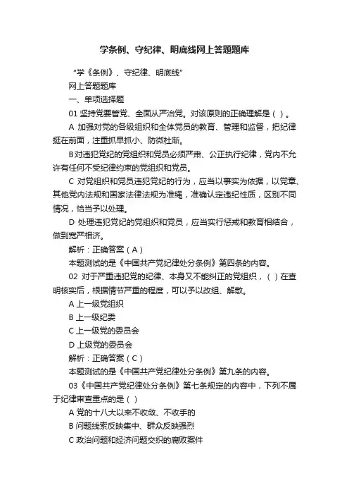 学条例、守纪律、明底线网上答题题库“学《条例》、守纪律、明底线”网上答题题库一、单项选择题01坚持党要管党、全面从严治党。