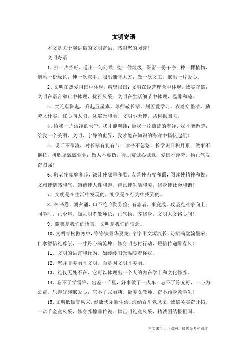 小学生文明寄语小学生文明寄语11、文明染红了花,吹绿了草,照亮了我们的心。