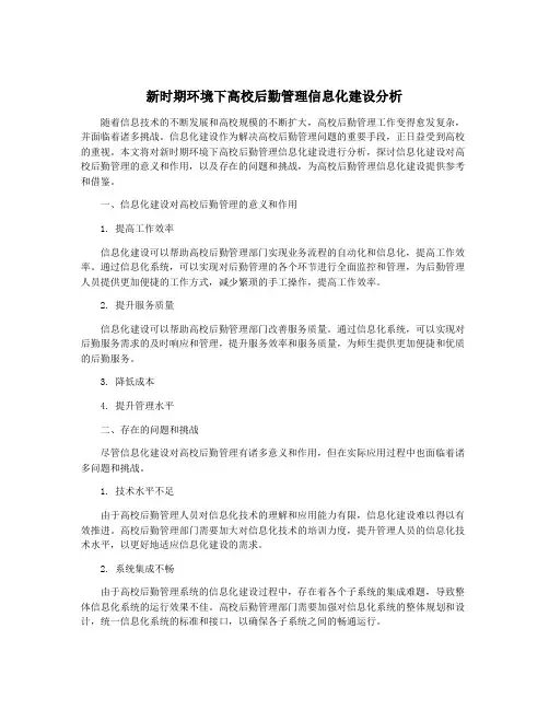 新时期环境下高校后勤管理信息化建设分析随着信息技术的不断发展和高校规模的不断扩大,高校后勤管理工作变得愈发复杂,并面临着诸多挑战。