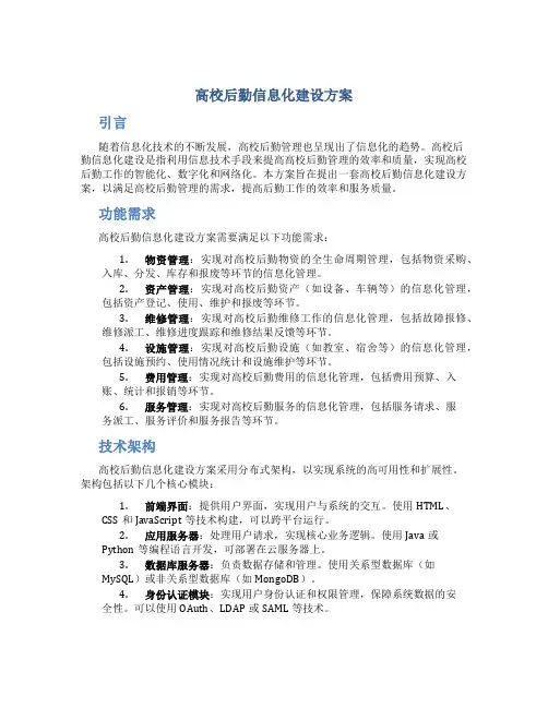 三、技术方案1. 建设信息化平台:针对高校后勤管理的复杂性和多样性,建设一个统一的信息化平台是必要的。