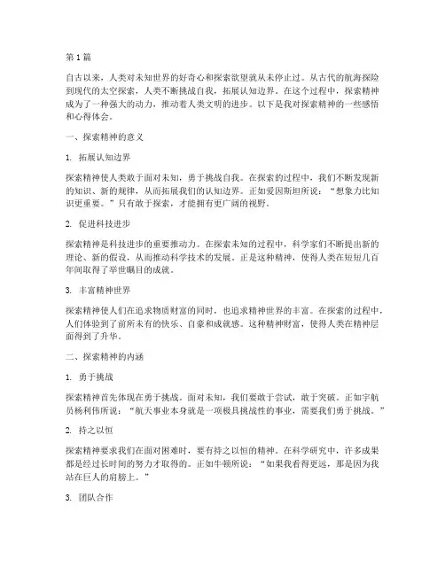 一、探索精神的意义1. 拓展认知边界探索精神使人类敢于面对未知,勇于挑战自我。