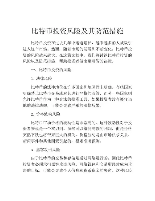 二、比特币投资的防范措施1. 研究和分析投资者应该花时间研究比特币以及相关的投资机会,在了解自己的投资目标和利润目标后,做好投资准备。