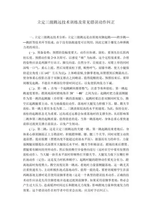 立定三级跳远技术训练及常见错误动作纠正一、立定三级跳远技术分析:立定三级跳远是由原地双脚起跳──跨步跳──跳跃等技术环节组成。
