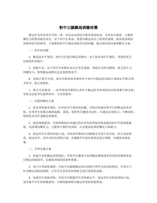一、存在的问题1. 跳远技术不规范:初中生在进行跳远训练时,由于技术动作不规范,导致距离无法得到有效提升。