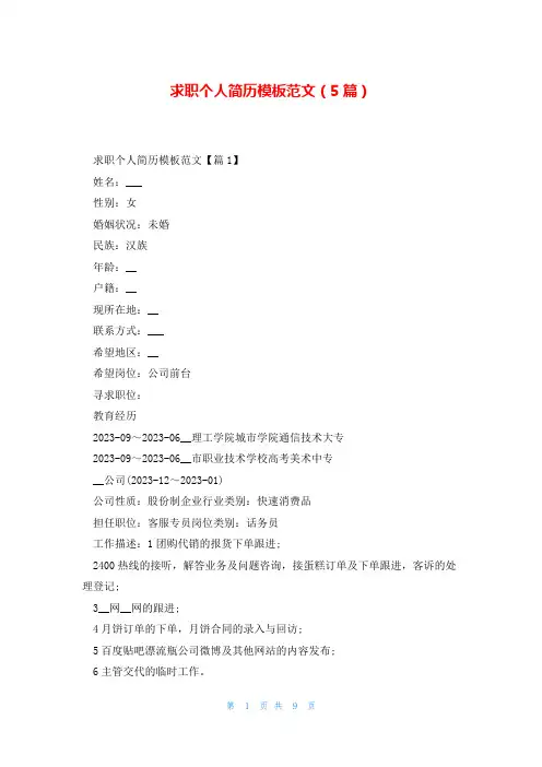 求职个人简历模板范文(5篇)求职个人简历模板范文【篇1】姓名:___性别:女婚姻状况:未婚民族:汉族年龄:__户籍:__现所在地:__联系方式:___希望地区:__希望岗位:公司前台寻求职位:教育经历2023-09~2023-06__理工学院城市学院通信技术大专2023-09~2023-06__市职业技术学校高考美术中专__公司(2023-12~2023-01)公司性质:股份制企业行业类别:快速消费品担任职位:客服专员岗位类别:话务员工作描述:1团购代销的报货下单跟进;2400热线的接听,解答业务及问题咨询,接蛋糕订单及下单跟进,客诉的处理登记;3__网__网的跟进;4月饼订单的下单,月饼合同的录入与回访;5百度贴吧漂流瓶公司微博及其他网站的内容发布;6主管交代的临时工作。