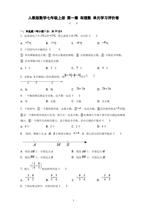 人教版数学七年级上册 第一章 有理数 单元学习评价卷()一、单选题(每小题3分,共36分)1.如果温度上升1℃记作℃,那么温度下降5℃,应记作( )1+A .℃B .℃C .℃D .℃5+5-6+6-2.下列语句中正确的有 ()① 所有整数都是正数;② 所有正数都是整数;③ 自然数都是正数;④ 分数是有理数;⑤ 在有理数中除了正数就是负数.A . 个B . 个C . 个D . 个12343.实数a 、b 在数轴上的位置如图,则等于 a b ab+--()A .2aB .2bC .D .2b 2a-2b 2a+4.一个数的相反数是非负数,这个数一定是( )A .零B .负数C .正数D .非正数5.下列语句:①一个数的绝对值一定最正数;②一定是负数;③没有绝对值是的数;a -3-④若一个数的绝对值是它本身,那么它一定是正数;⑤在数轴左半轴上离开原点越远的数就越小;⑥一个数比它的相反数大,这个数是非负数.其中正确的个数有( )A .0个B .3个C .2个D .4个6. 如图,数轴上点A ,M ,B 分别表示数a ,,b ,那么原点的位置可能是()a b +A .线段AM 上,且靠近点A B .线段AM 上,且靠近点M C .线段上,且靠近点BD .线段上,且靠近点MBM BM 7.能与相加得0的是( )3645⎛⎫-- ⎪⎝⎭A .B .C .D .3645--6354+6354-+3645-+8.下列运算过程中,有错误的是( )A .(3﹣4)×2=3﹣4×21212B .﹣4×(﹣7)×(﹣125)=﹣(4×125×7)C .9×16=(10﹣)×16=160﹣18191191619D .[3×(﹣25)]×(﹣2)=3×[(﹣25)×(﹣2)]9.已知数a ,b ,c 的大小关系如图,下列说法:①ab+ac>8;②-a-b+c<0;③;④|a-b|+|c+b|-|a-c|=-2b ;⑤若x 为数轴上任意一个数,则|x-b|+|x-a|的最小1a b ca b c++=-值为a-b .其中正确结论的个数是( )A .1B .2C .3D .410.按如图所示的运算程序,若输入x =2,y =1,则输出结果为()A .1B .4C .5D .911.第七次全国人口普查数据显示,山东省常住人口约为10152.7万人,将101 527 000用科学记数法(精确到十万位)( )A .1.02×108B .0.102×109C .1.015×108D .0.1015×10912.我国第十四个五年规划和2035年远景目标纲要中阐释了“坚持农业农村优先发展,全面推进乡村振兴”的具体目标:坚持最严格的耕地保护制度,实施高标准农田建设工程,建成亿亩集中连片高标准农田,下列关于亿的说法正确的是( )10.7510.75A .亿是精确到亿位10.75B .亿是精确到十亿位10.75C .亿用科学记数法表示为,则,10.7510na ⨯ 1.075a =9n =D .亿用科学记数法表示为,则,10.7510na ⨯10.75a =8n =二、填空题(每小题3分,共24分)13.一袋糖果包装上印有“总质量”的字样.小明拿去称了一下,发现质量为,(5005)g ±497g 则该糖果厂家_____________(填“有”或“没有”)欺诈行为.14.在和1之间的负整数有______个.526-15.已知有理数、满足,则________.a b 2|3|(1)0a b -++=a b +=16.在数轴上,把表示的点移动5个单位长度后,所得对应点的数是______.2-17.计算:1-(+2)+3-(+4)+5-(+6)+…-(+2014)=_________.18.从-3、-1、0、+2、+4 中,任取 3 个数相乘,则乘积的最大值是________.19.月球沿着一定的轨道围绕地球运动,它的半长轴约为385000千米,这个数据用科学记数法精确到万位表示,应记为________千米.20.用四舍五入法取近似数:2.7982≈ __________(精确到0.01).三、解答题(本大题共40分)21.(4分)把下面的数填入它所属于的集合的大括号内(填序号)①,②,③20%,④0,⑤,⑥,⑦,⑧5.3-5+27-7-3--∣∣( 1.8)--正数集合{ }整数集合{ }分数集合{ }有理数集合{ }22.(12分)计算:(1)(﹣21)﹣(﹣9)+(﹣8)﹣(﹣12);(2);152()(36)469-+-⨯-(3);421328()44--⨯-+(4).32200913(2)(2)2|(1)1|84-⨯-÷--⨯-⨯+23.(4分)已知有理数a 、b 互为相反数,c 、d 互为倒数,m 是平方等于它本身的数,求代数式4(a +b )﹣(cd )5+m 的值.24.(4分)计算:已知14m n ==,(1)当时,求的值;0m <m n +(2)求的最大值;-m n 25.(4分)实数a ,b ,c 在数轴上的对应点位置如图:(1)用“<”连接0,a ,b ,c 四个数;(2)化简:①;||||a c b c -+-②.||||a b a c +-+26.(6分)某巡警骑摩托车在一条南北大道上巡逻.某天他从岗亭出发,晚上停留在处,A 规定向北方向为正.当天行驶记录如下(单位:千米).10,8,6,13,7,12,3,2+-+-+-+-(1)该巡警巡逻时离岗亭最远是多少千米?A(2)在岗亭什么方向?距岗亭多远?(3)若摩托车每行1千米耗油0.05升,那么该摩托车这天巡逻共耗油多少升?327.(6分)已知M、N在数轴上,M对应的数是,点N在M的右边,且距M点4个单位长度,点P、Q是数轴上两个动点:(1)直接写出点N所对应的数;(2)当点P到点M、N的距离之和是5个单位时,求点P所对应的数;(3)如果P、Q分别从点M、N出发,均沿数轴向左运动,点P每秒走2个单位长度,先出发5秒钟,点Q每秒走3个单位长度,当P、Q两点相距2个单位长度时,点P、Q对应的数各是多少?答案1.B解:如果温度上升1℃记作+1℃,即初始温度为0℃,那么温度下降5℃记作-5℃,故选:B.2.A解:①所有整数都是正数,错误,比如-1;②所有正数都是整数,错误,比如0.5;③自然数都是正数,错误,比如0;④分数是有理数,正确;⑤在有理数中除了正数就是负数,错误,还有零;∴正确的有一个;故选A.3.A解:根据实数a、b在数轴上的位置得知:a<0,b>0,a+b>0, a﹣b<0∴|a+b|=a+b,|a﹣b|=b﹣a,∴|a+b|-|a﹣b|=a+b-b+a=2a,故选A.4.D解:非负数是指正数或 0,而负数的相反数是正数,0 的相反数是 0,所以这个数一定是负数或 0.故选:D.5.C解:①一个数的绝对值一定最非负数,故错误;a-②不一定是负数,有可能为0或正数,故错误;3-③没有绝对值是的数,故正确;④若一个数的绝对值是它本身,那么它一定是正数或0,故错误;⑤在数轴左半轴上离开原点越远的数就越小,没有指明数轴正方向,故错误;⑥一个数比它的相反数大,这个数是非负数,故正确;故选:C.6.A解:∵数轴上点A ,M ,B 分别表示数a ,,b ,a b+∴由它们的位置可得a <0,a +b >0,b >0且|a |<|b |,∴据此