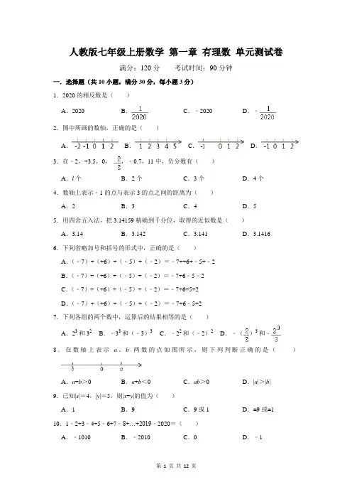人教版七年级上册数学第一章有理数单元测试卷满分:120分考试时间:90分钟一.选择题(共10小题,满分30分,每小题3分)1.2020的相反数是()A.2020 B.C.﹣2020 D.﹣2.图中所画的数轴,正确的是()A.B.C.D.3.在﹣2,+3.5,0,,﹣0.7,11中,负分数有()A.l个B.2个C.3个D.4个4.数轴上表示﹣1的点与表示3的点之间的距离为()A.2 B.3 C.4 D.55.用四舍五入法,把3.14159精确到千分位,取得的近似数是()A.3.14 B.3.142 C.3.141 D.3.14166.下列省略加号和括号的形式中,正确的是()A.(﹣7)+(+6)+(﹣5)+(﹣2)=﹣7++6+﹣5+﹣2B.(﹣7)+(+6)+(﹣5)+(﹣2)=﹣7+6﹣5﹣2C.(﹣7)+(+6)+(﹣5)+(﹣2)=﹣7+6+5+2D.(﹣7)+(+6)+(﹣5)+(﹣2)=﹣7+6﹣5+27.下列各组的两个数中,运算后的结果相等的是()A.23和32 B.﹣33和(﹣3)3 C.﹣22和(﹣2)2 D.﹣()3和﹣8.在数轴上表示a、b两数的点如图所示,则下列判断正确的是()A.a+b>0 B.a+b<0 C.ab>0 D.|a|>|b|9.已知|x|=4,|y|=5,则|x+y|的值为()A.1 B.9 C.9或1 D.±9或±110.1﹣2+3﹣4+5﹣6+7﹣8+…+2019﹣2020=()A.﹣1010 B.﹣2010 C.0 D.﹣1二.填空题(共7小题,满分28分,每小题4分)11.﹣的倒数是,﹣3的绝对值是.12.零上25摄氏度记作+25℃,那么零下10摄氏度记作℃.13.某种零件,标明要求是φ:20±0.02 mm(φ表示直径,单位:毫米),经检查,一个零件的直径是19.9 mm,该零件(填“合格”或“不合格”).14.比较大小:﹣﹣15.我国最大的领海是南海,总面积有3500000km2,用科学记数法可表示为km2.16.小红在写作业时,不慎将一滴墨水滴在数轴上,根据图中的数据,请确定墨迹遮盖住的整数共有个.17.定义一种新运算:a※b=a+b﹣ab,如2※(﹣2)=2+(﹣2)﹣2×(﹣2)=4,那么(﹣1)※(﹣4)=.三.解答题(共8小题,满分62分)18.(6分)把下列个数填在相应的括号里﹣2,,0.618,2022,﹣3,﹣8%,π,27,﹣14.分数集合:{};正整数集合:{};负有理数集合:{}.19.(6分)计算:(1)(﹣18)+41+18﹣(﹣59)(2)(﹣)﹣15+()20.(6分)若a、b互为相反数,c、d互为倒数,m的绝对值为2,求代数式m﹣cd+(a+b)m2的值.21.(8分)计算:(1)16÷(﹣2)3﹣(﹣)×(﹣4)+(﹣1)2020;(2)﹣14﹣(1﹣0.5)××[2﹣(﹣3)2].22.(8分)已知有理数﹣0.5,+2,﹣|﹣2.5|,﹣(﹣1),(﹣2)2(1)在数轴上标出以上各数;(2)把以上各数用“>”号连接起来.23.(8分)某天一个巡警骑摩托车在一条南北大道上巡逻,他从岗亭出发,规定岗亭为原点,向北为正,这段时间行驶记录如下(单位:千米)+10,﹣9,+7,﹣15,+6,﹣14,+4,﹣2(1)最后停留的地方在岗亭的哪个方向?距离岗亭多远?(2)若摩托车行驶,每千米耗油0.06升,每升6.2元,且最后返回岗亭,这一天耗油共需多少元?24.(10分)在学习完《有理数》后,小奇对运算产生了浓厚的兴趣.借助有理数的运算,定义了一种新运算“⊕”,规则如下:a⊕b=a×b+2×a.(1)求2⊕(﹣1)的值;(2)求﹣3⊕(﹣4⊕)的值;(3)试用学习有理数的经验和方法来探究这种新运算“⊕”是否具有交换律?请写出你的探究过程.25.(10分)已知M、N在数轴上,M对应的数是﹣3,点N在M的右边,且距M点4个单位长度,点P、Q是数轴上两个动点;(1)直接写出点N所对应的数;(2)当点P到点M、N的距离之和是5个单位时,点P所对应的数是多少?(3)如果P、Q分别从点M、N出发,均沿数轴向左运动,点P每秒走2个单位长度,先出发5秒钟,点Q每秒走3个单位长度,当P、Q两点相距2个单位长度时,点P、Q 对应的数各是多少?人教版七年级上册数学第一章有理数单元测试卷答题卡班级:_________姓名:_________学号:_________成绩:_________一.选择题(共10小题,满分30分,每小题3分)(请将答案填写在各试题的答题区内)题号 1 2 3 4 5 6 7 8 9 10答案二.填空题(共7小题,满分28分,每小题4分)(请在各试题的答题区内作答)11. ;12. 13. 14.15. 16. 17.三.解答题(共8小题,满分62分)(请在各试题的答题区内作答)18.分数集合:{};正整数集合:{};负有理数集合:{}.19.(1)(﹣18)+41+18﹣(﹣59)(2)(﹣)﹣15+()20.21.(1)16÷(﹣2)3﹣(﹣)×(﹣4)+(﹣1)2020;(2)﹣14﹣(1﹣0.5)××[2﹣(﹣3)2].22.23.24.25.参考答案一.选择题(共10小题,满分30分,每小题3分)1.解:2020的相反数是:﹣2020.故选:C.2.解:A、没有正方向,故错误;B、没有原点,故错误;C、单位长度不统一,故错误;D、正确.故选:D.3.解:负分数是﹣,﹣0.7,共2个.故选:B.4.解:法一、如图所示,点A表示﹣1,点B表示3,∴两点间的距离是4;故选C.法二、3﹣(﹣1)=4故选:C.5.解:把3.14159精确到千分位约为3.142,故选:B.6.解:A、原式=﹣7+6﹣5﹣2,错误;B、原式=﹣7+6﹣5﹣2,正确;C、原式=﹣7+6﹣5﹣2,错误;D、原式=﹣7+6﹣5﹣2,错误,故选:B.7.解:A、23=8,32=9,不相等;B、﹣33=(﹣3)3=﹣27,相等;C、﹣22=﹣4,(﹣2)2=4,不相等;D、﹣()3=﹣,﹣=﹣,不相等,故选:B.8.解:由数轴可知,a为正数,b为负数,且|a|<|b|,∴a+b应该是负数,即a+b<0,又∵a>0,b<0,ab<0,故答案A、C、D错误.故选:B.9.解:|x|=4,|y|=5,x=±4,y=±5,当x=﹣4,y=﹣5时,|x+y|=9当x=﹣4,y=5时,|x+y|=1,当x=4,y=﹣5时,|x+y|=1,当x=4,y=5时,|x+y|=9,故选:C.10.解:1﹣2+3﹣4+5﹣6+7﹣8+9﹣10+…+2019﹣2020=(1﹣2)+(3﹣4)+(5﹣6)+…+(2019﹣2020)=(﹣1)+(﹣1)+(﹣1)+(﹣1)+…+(﹣1)=(﹣1)×=(﹣1)×1010=﹣1010故选:A.二.填空题(共7小题,满分28分,每小题4分)11.解:﹣的倒数是:﹣,﹣3的绝对值是:3.故答案为:﹣,3.12.解:零上25摄氏度记作+25℃,那么零下10摄氏度记作﹣10℃,故答案为:﹣10.13.解:零件合格范围在19.98和20.02之间.19.9<19.98,所以不合格.故答案为:不合格.14.解:∵|﹣|=,|﹣|=,<,∴﹣>﹣.故答案为:>.15.解:将3500000用科学记数法表示为:3.5×106.故答案为:3.5×106.16.解:∵﹣和2之间的整数有3个:﹣1、0、1,∴墨迹遮盖住的整数共有3个.故答案为:3.17.解:(﹣1)※(﹣4)=(﹣1)+(﹣4)﹣(﹣1)×(﹣4)=(﹣1)+(﹣4)﹣4=﹣9,故答案为﹣9.
