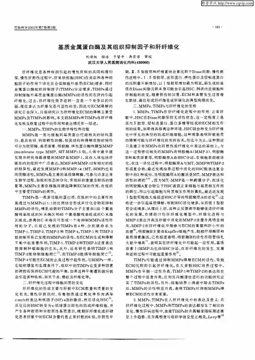 组织金属蛋白酶及其抑制因子与肝纤维化(作者:___________单位: ___________邮编: ___________)【摘要】基质金属蛋白酶(matrix metalloproteinase,MMP)是体内重要的水解酶之一,几乎能降解细胞外基质(extracellular matrix,ECM)的所有成分;基质金属蛋白酶组织抑制因子(tissue inhibitor of metalloproteinasas,TIMPs )是MMPs的内源性抑制系统。