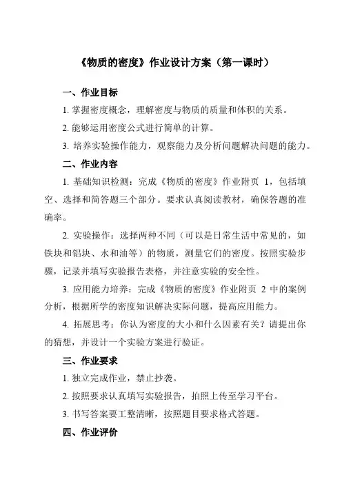 《物质的密度》作业设计方案(第一课时)一、作业目标1. 掌握密度概念,理解密度与物质的质量和体积的关系。