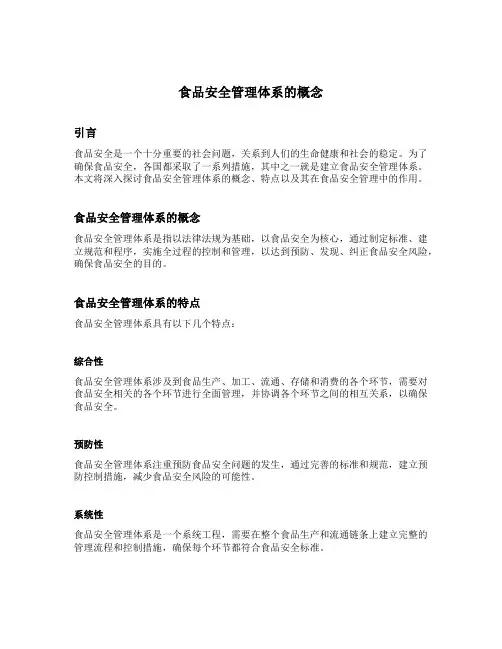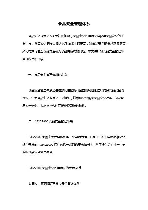 一、食品安全管理体系概述食品安全管理体系是指企业为保障食品安全,从组织上、管理上、技术上等各个方面,实现对食品生产过程中食品安全的掌控和管理过程。