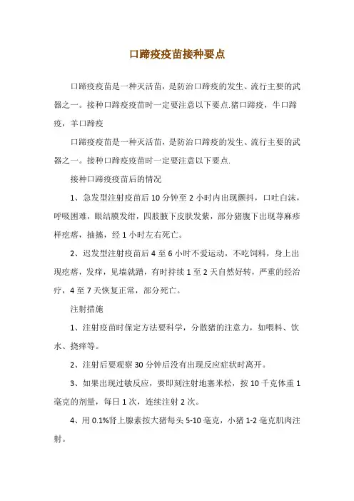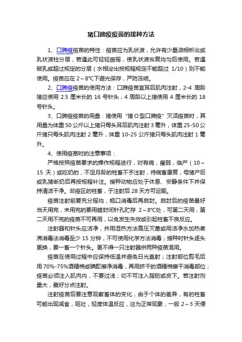 2. 口蹄疫疫苗的使用方法口蹄疫疫苗的使用方法如下:2.1 接种时间根据动物的生长发育情况和流行病学调查结果,选择合适的接种时间。