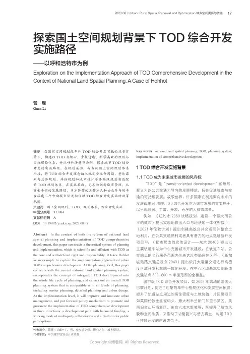 Key words national land spatial planning; TOD; planning system; implementation of comprehensive development1 TOD 综合开发实施背景1.1 TOD 成为未来城市发展的风向标“TOD”是“transit-oriented development”的缩写,释义为以公共交通为导向的发展模式,旨在促进城市与交通的可持续发展。