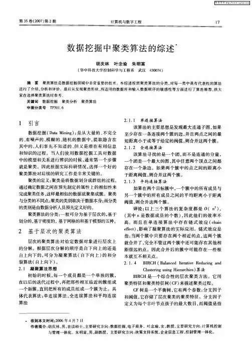 针对当前数据挖掘在⼤数据⽅⾯的应⽤,本⽂从数据挖掘的各个阶段进⾏了⽅法论的总结及应⽤,主要包括数据准备的⽅法、数据探索的⽅法、关联规则⽅法、数据回归⽅法、数据分类⽅法、数据聚类⽅法、数据预测⽅法和数据诊断⽅法。