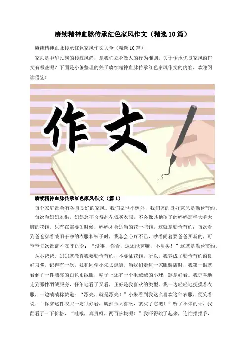 赓续精神血脉传承红色家风作文(精选10篇)赓续精神血脉传承红色家风作文大全(精选10篇)家风是中华民族的传统风尚,是我们立身做人的行为准则,关于传承优良家风的作文有哪些呢?下面是小编整理的关于赓续精神血脉传承红色家风作文的内容,欢迎阅读借鉴!赓续精神血脉传承红色家风作文(篇1)每个家庭都会有各自良好的家风。