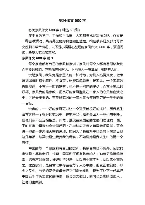 传承好家风的作文600字传承好家风的作文600字(通用58篇)在日复一日的学习、工作或生活中,大家都不可避免地会接触到作文吧,借助作文人们可以反映客观事物、表达思想感情、传递知识信息。